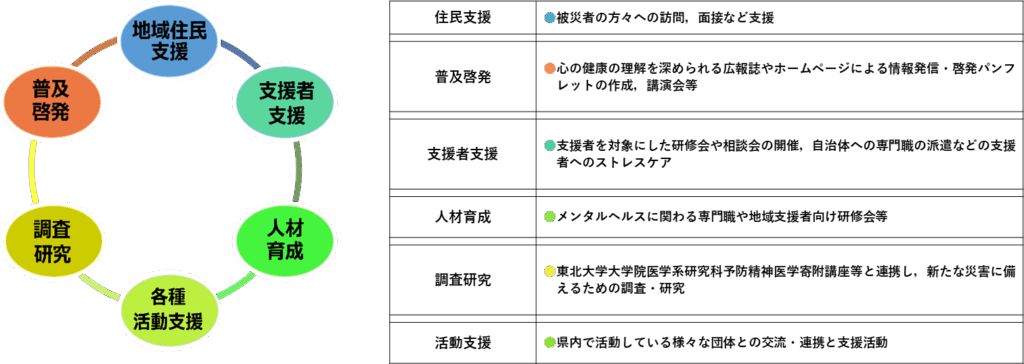 ・視察で訪れた「心のケアセンター」の資料や市町担当者に実施したヒアリングを踏まえ、立ち上げ当時の当センター職員や東北大学予防精神医学寄附講座職員らと検討し、想定される業務内容を6つの柱(地域住民支援、支援者支援、人材育成、普及啓発、調査研究、各種活動支援)に整理しました(下図)。