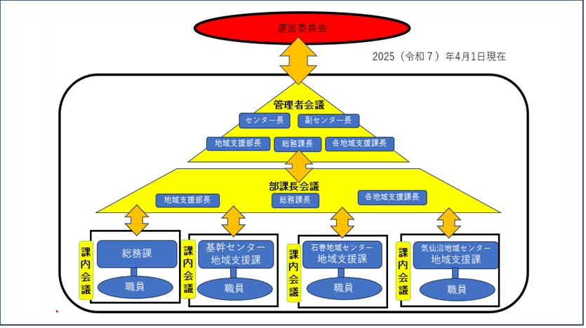 | 管理者会議(月1回) | センターの重要課題及び部課長会議における検討課題等についての協議や意思決定、事業に関する情報の共有、情報の発信等を行う。 | センター長、副センター長、部長、各課長 |